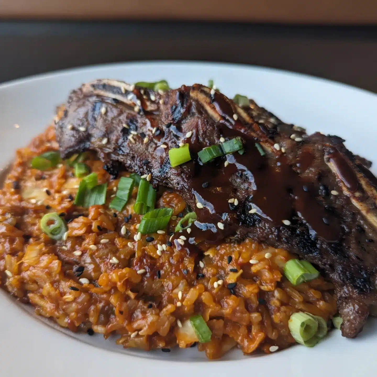 Marinated Bone-in Korean Style Beef Short Ribs on a pile of Kimchi Fried Rice topped w/ Green Onion & Toasted Sesame Seeds | 28